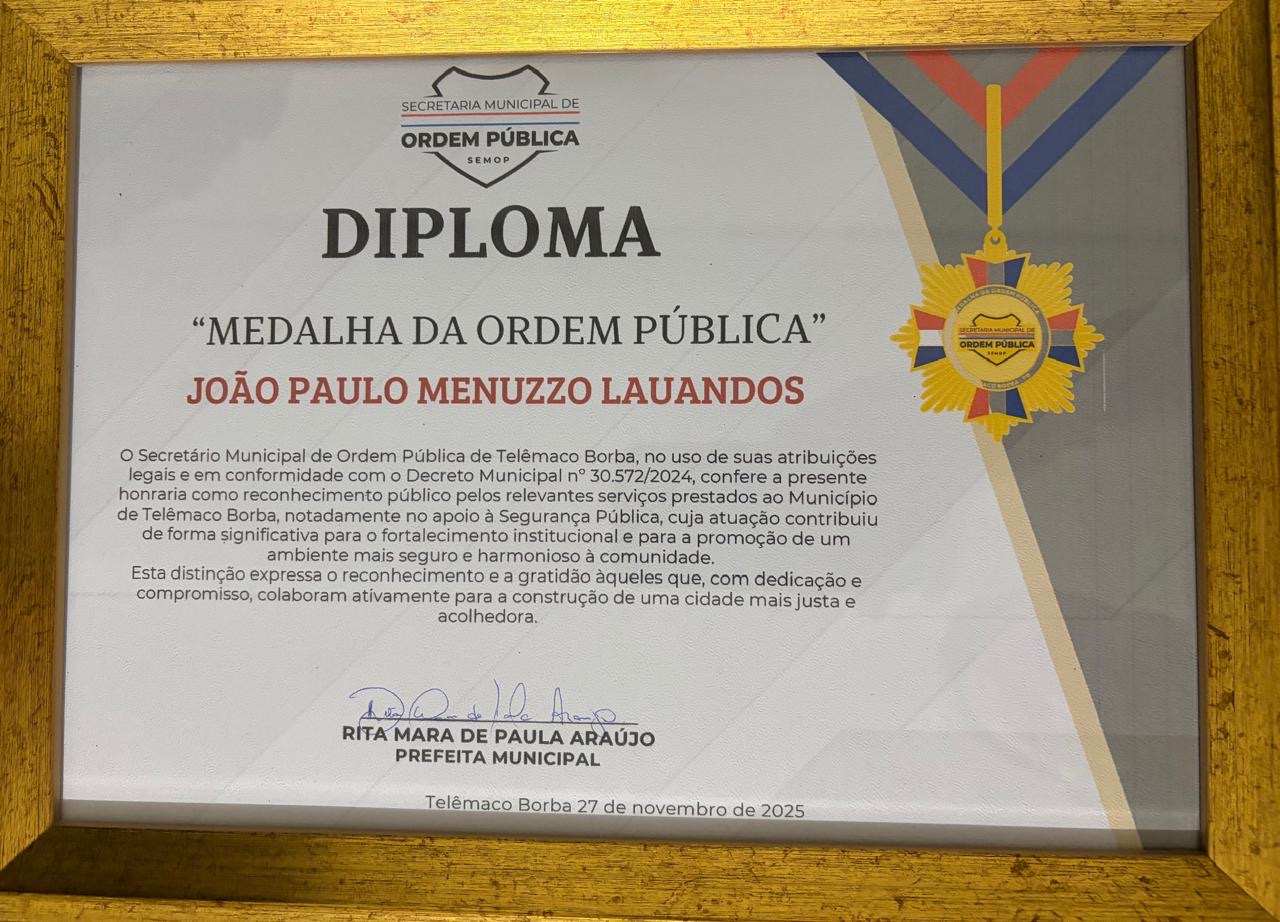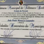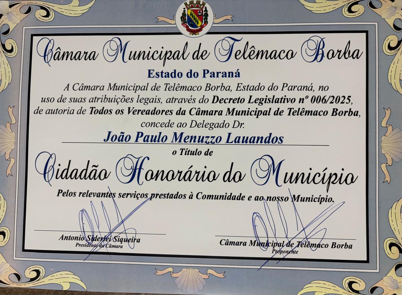 A Associação dos Delegados de Polícia do Paraná parabeniza o Delegado Associado Dr. João Paulo Menuzzo Lauandos, que foi homenageado na noite de quinta-feira (27) em sessão solene realizada no Plenário da Câmara Municipal de Telêmaco Borba.