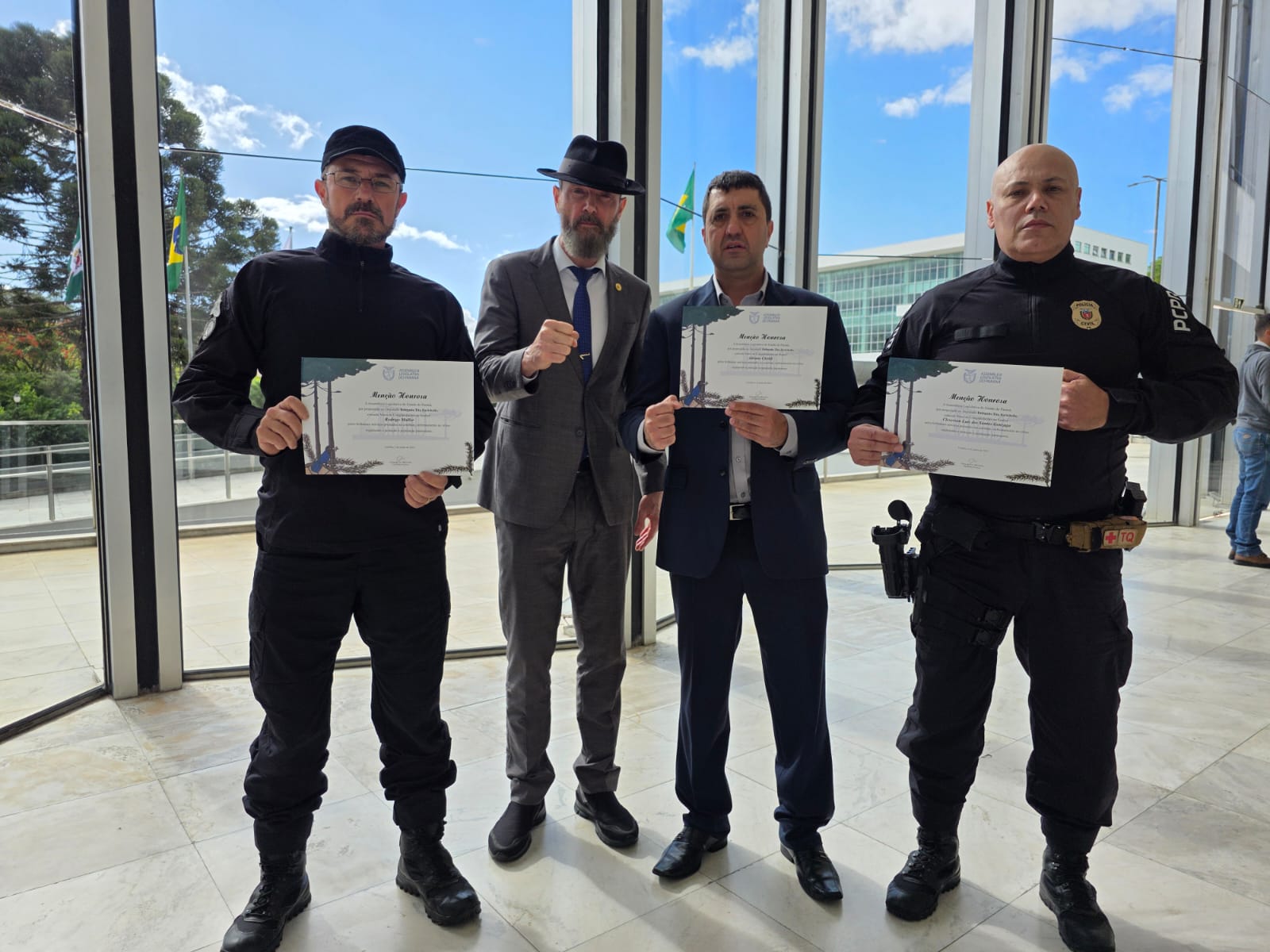 O Presidente da Associação dos Delegados de Polícia do Estado do Paraná (ADEPOL-PR), Dr. Adriano Chohfi, e os membros da equipe da Delegacia de Explosivos, Armas e Munições (DEAM) foram homenageados na Assembleia Legislativa do Paraná, nesta segunda-feira (20). A iniciativa foi em reconhecimento à atuação no caso do artefato explosivo encontrado no dia 31 de março deste ano, no Terminal do Boqueirão, em Curitiba.