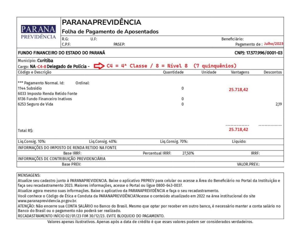 O primeiro passo é identificar em qual classe e nível o Delegado estava localizado na tabela de subsídios que vigorou até julho de 2023.